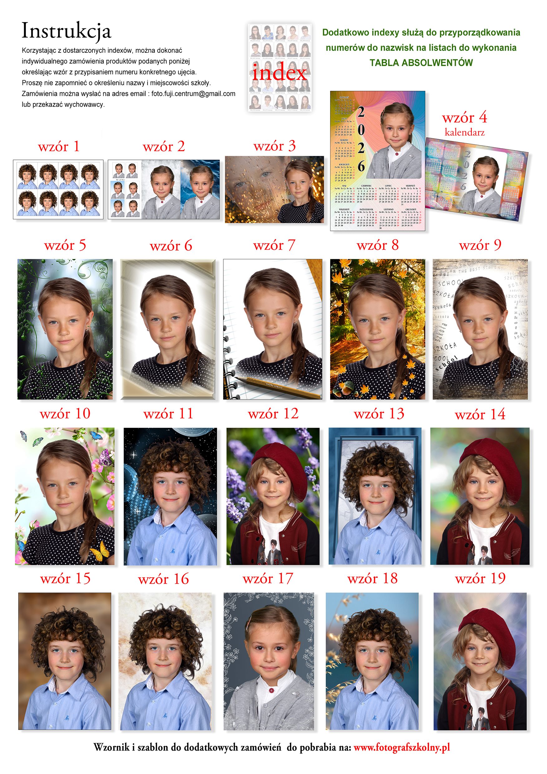 W szkołach podstawowych w klasach „0”, „1”, „3” i „6”, a w gimnazjach i szkołach średnich w klasach kończących wykonujemy wszystkim uczniom zdjęcia legitymacyjne przekazywanych w formie fotoindeksu, na podstawie którego uczeń lub rodzic może zamówić wykonanie zdjęć legitymacyjnych, składki bądź Mini Tabla. W pozostałych klasach zdjęcia legitymacyjne lub składki wykonywane są na indywidualne zamówienia uczniów lub rodziców.